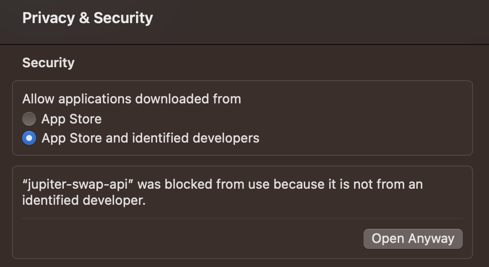 “jupiter-swap-api” can’t be opened because Apple cannot check it for malicious software.